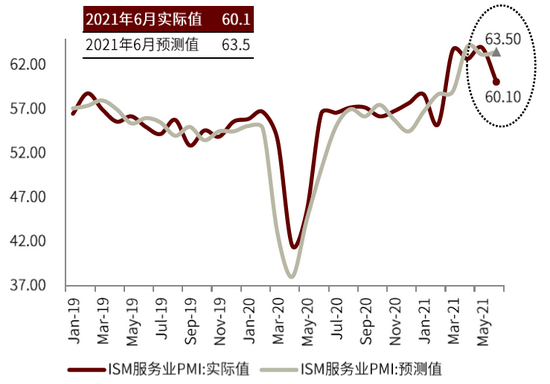 7月6日发布的美国服务业PMI数据低于预期,成为美债利率再次急跌的催化剂。虽然不少投资者对美国经济复苏(尤其是服务业复苏)持乐观态度,我们在《2021年中大类资产配置展望:复苏错位,轮动异步》里提示过美国经济复苏的高点可能在第二季度。如果未来经济复苏强度不及预期,资产价格可能出现扰动。