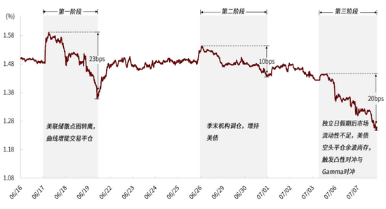 我们把最近美债利率急跌分为3个阶段,剖析每个阶段的交易因素:第一阶段(6/16-6/19):曲线增陡交易平仓导致长端利率下跌; 第二阶段(6/26-6/30):季度末机构调仓维持利率下行动能; 第三阶段 (7/6-7/8):市场流动性不足叠加平仓余波未平,触发凸性对冲与Gamma对冲。