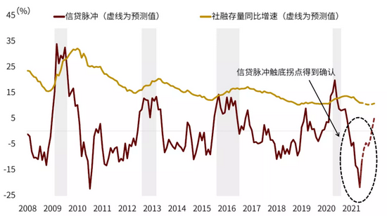 最后是基数效应。去年3-5月受疫情冲击影响,新增信贷投放远超历史同期;进入下半年之后,信贷投放逐步正常化。我们使用的信贷指标(社融存量同比增速与信贷脉冲)都以去年同期数据作为基数。随着去年3-5月份数据退出计算窗口,在技术上提高了信贷增速和信贷脉冲的数值。