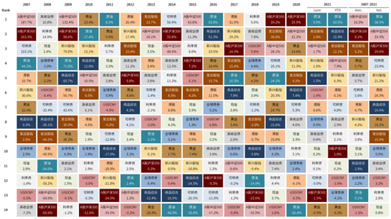 *现金:2014年及以前使用1周期银行理财收益率年均值,2014年以后使用余额宝7日年化收益率年均值;利率债:中债总财富指数;高收益债:中债企业债AA总财富指数;可转债:中证转债指数;全球债券:JPM Global Aggregate Bond,调整为人民币计价;A股沪深300:沪深300全收益指数;A股中证500:中证500全收益指数;港股:恒生国企全收益指数,调整为人民币计价;发达股指:MSCI DM TR Index,调整为人民币计价;USDCNY:美元兑人民币汇率变化,正值代表投资美元资产的汇兑收益;原油:布伦特原油价格,调整为人民币计价;黄金:伦敦金现货价格,调整为人民币计价。数据截至2021年6月30日。