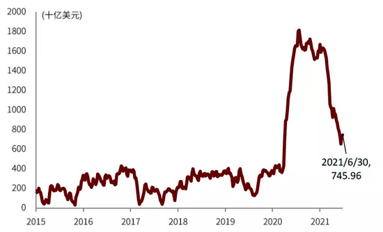 图表:我们预计美国财政部TGA账户在7月继续缩减,流动性继续注入金融系统