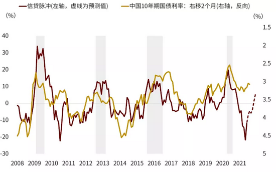 图表:信贷脉冲滞后国债利率2个月左右,信贷脉冲触底反弹为国债利率下行打开空间