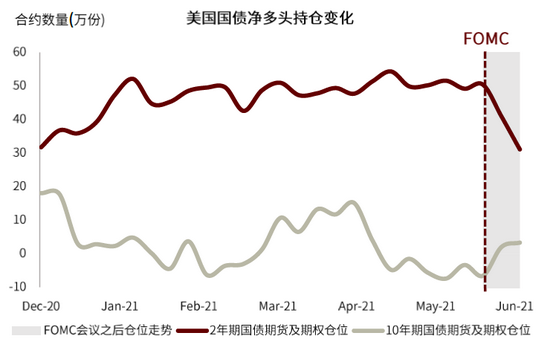 我们可以从美国资金管理账户(Asset Managers‘ Treasury future & options net long positions)观察到长短端国债期权和期货的净多头仓位变化。FOMC会议之前,2年期国债期权期货的多头仓位偏重,而10年期国债仓位偏空,很大程度上是曲线增陡交易建仓(买短端,卖长端)的结果。FOMC会议之后,曲线增陡交易被迫平仓(卖短端,买长端),表现为2年期国债多头仓位骤降,10年期国债净多头仓位增加(空头仓位减少)。