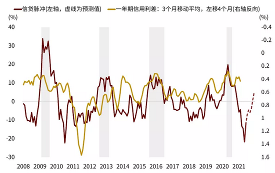图表:信贷脉冲领先1年期信用利差4个月左右,信贷脉冲下行可能加剧信用风险