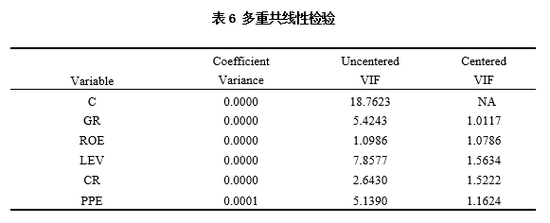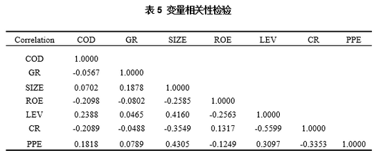 各变量的相关系数见表5。从表5的相关系数可以看出债务融资成本(COD)与企业绿色转型水平(GR)的相关系数为-0.059168,并且5%的水平上显著显著,即企业的绿色转型水平越高其债务融资成本越低。这初步验证了假设1。同时,企业的债务融资成本和净资产回报率在1%的显著水平下显著负相关,这与其他研究者的结果和我们的理论假设一致。说明好的盈利能力某种程度代表在低的违约风险,从而降低企业的债务融资成本。企业的杠杆率与债务融资成本在5%的显著水平下显著正相关,高杠杆率的企业面临的财务风险较大,债权人面临的违约风险也因此较大,所以债权人可能会提高利息率来抵消部分风险。回归的结果也与(Zhu,2014)的结论一致[20]。企业的流动比例(CR)与企业的债务融资成本的相关系数为-0.202734,在10%的水平上显著显著,说明流动性好的企业能够帮助投资人降低所面临的违约风险,这也与本文的预测一致。最后,在5%的显著水平上,企业的资产有形性与债务融资成本呈正相关。这一结果表明实物资产比例高的公司会因为其资金流动性降低,影响其盈利能力,从而增加其债务融资成本。由表6可以看出,通过检验方差膨胀系数VIF均小于2,可以得出多重共线性问题较弱。