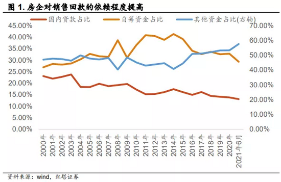 在外部融资受限的时候,房企对销售回款的依赖度明显上升。在2021年前六个月里,房地产开发资金各项来源中,其他资金(主要是定金及预收款以及个人按揭贷款)的占比达到了57.6%,比2020年末提高了4.3个百分点,与之对应的自筹资金以及国内贷款则出现了明显下滑。