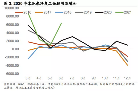 比如自2020年四季度开始,房企的净复工面积(当期净复工面积=当期新增施工面积-当期新增开工面积)相比于往年明显回升。
