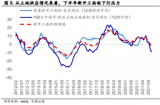 从数据上可以看到,100大中城市供应土地占地面积的同比大约领先于房地产新开工同比6个月左右。