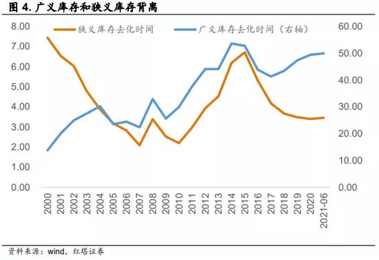 从库存角度上看,我们能够发现,近年来,在狭义库存走低的时候,广义库存(累计新开工-累计房地产销售)是在明显走高的。