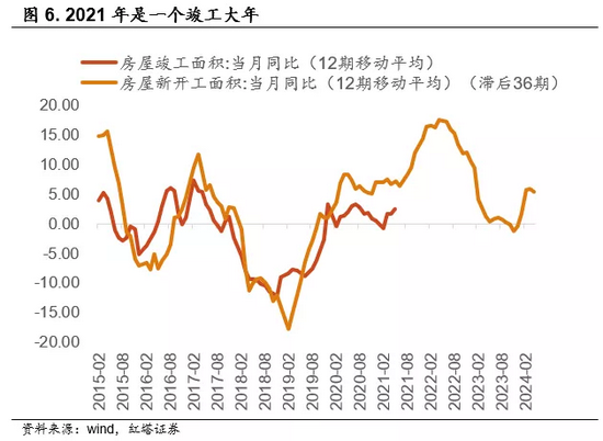 而2018年是房地产新开工的一个上行周期,对应2021年会是一个竣工大年,叠加为了满足监管的要求,房企本身也有加快竣工的诉求,预计今年地产竣工会继续回升。这一回升力度预计能够延续到2021年末至2022年上半年。