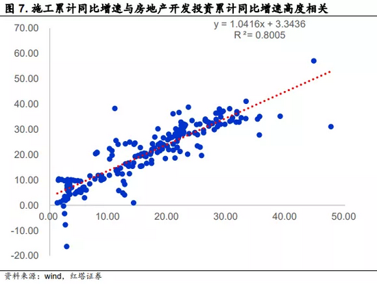 回顾房地产投资同比增速,我们就会发现国内房地产投资累计同比增速与施工面积累计同比增速之间存在明显的正相关关系。