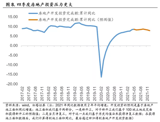 可以看到因为基数、新开工面积减少等原因,今年下半年房地产开发同比增速继续下滑,从两年平均增速来看,四季度房地产面临的压力比较大,预计全年房地产开发投资在6.5-8.5%左右。