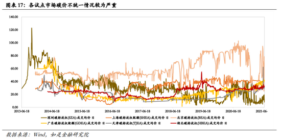 2、碳排放配额(CEA)市场:各地区试点已初具规模,价格分化严重