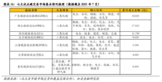 覆盖行业——初期仅覆盖电力行业,后期将会扩容。根据上海环交所发布的《关于全国碳排放权交易相关事项的公告》,全国碳排放权交易市场覆盖的温室气体种类和行业范围将由生态环境部拟订。2021年7月国务院新闻办公室例行吹风会上表示,根据国务院批准的全国碳市场建设方案,在市场运行初期只在发电行业的重点排放单位间开展配额现货交易。但未来全国性碳市场将会以电力行业作为突破口,按照“成熟一个、纳入一个”的原则来纳入其他行业。石化、化工、建材、钢铁、有色金属、造纸、国内民用航空等行业将被逐步加入当前全国碳交易体系中。