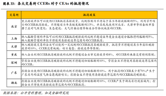 依5%抵消份额测算,未来全国性碳市场每年将有约277万吨二氧化碳当量市场份额。各试点均规定了核证自愿减排的抵消机制,即纳入碳排放交易的单位可以通过购买国家核证自愿减排量抵消其超额温室其他排放。抵消机制的设计进一步扩张了碳排放交易市场对国家核证自愿减排量的需求,进而激励了温室气体自愿减排项目的实施。各地区对于CCERs的对CEAs的抵消能力做出了统一的规定,即1个CCER等同于1个配额,可以抵消1吨二氧化碳当量的排放,但各地区对于抵消比例和抵消条件的规定都有所不同。根据生态环境部发布的《碳排放权交易管理办法(试行)》,重点排放单位每年可以使用国家核证自愿减排量(CCERs)抵消碳排放配额(CEAs)的清缴,抵消比例不得超过应清缴碳排放配额的5%。若以5%抵消份额测算,未来全国性碳市场每年将有约277万吨二氧化碳当量市场份额。