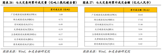 根据七大碳排放权交易所披露的信息,按累计成交量计算,七大交易所累计成交3.51亿吨二氧化碳当量,广东、湖北、深圳交易规模位列三甲。截止到2021年7月初,当前深圳碳排放权(SZA)交易所、上海碳排放权配额(SHEA)交易所、北京碳排放权(BEA)交易所、广东碳排放权配额(GDEA)交易所、天津碳排放权(TJEA)交易所、湖北碳排放权(HBEA):交易所、重庆碳排放权(CQEA)交易所累计成交量分别为0.49亿吨二氧化碳当量、0.17亿吨二氧化碳当量、0.15亿吨二氧化碳当量、1.68亿吨二氧化碳当量、0.19亿吨二氧化碳当量、0.75亿吨二氧化碳当量、0.09亿吨二氧化碳当量。