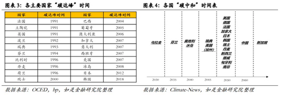 “碳达峰”是二氧化碳排放量由增转降的历史拐点,“碳中和”是实现二氧化碳“净零排放”。碳达峰与碳中和紧密相连,前者是后者的基础和前提,达峰时间的早晚和峰值的高低直接影响碳中和实现的时长和实现的难度。后者是对前者的紧约束,要求达峰行动方案必须要在实现碳中和的引领下制定。碳中和与碳达峰时间点则代表了一国减排的时间点与决心,也将间接反映该国及减少二氧化碳排放的整体路径。