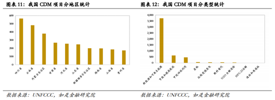 从实际减排效果来看,全国31个省市自治区共计实现减排量(估算年减排量)达7.82亿吨二氧化碳当量。UNFCCC将各大CDM项目进行了年减排量预估,并将各类温室气体的减排转化为以每吨二氧化碳当量(tCO2e)为计量单位。其中受CDM设立项目影响,四川、内蒙等地效果较为明显,新能源和可再生能源行业、节能和提高能效行业减排效果明显。根据UNFCCC官网统计资料,我国通过CDM项目减排效果最为明显的前十大地区分别为四川省(0.89亿吨二氧化碳当量)、山西省(0.56亿吨二氧化碳当量)、内蒙古自治区(0.55亿吨二氧化碳当量)、云南省(0.50亿吨二氧化碳当量)、江苏省(0.44亿吨二氧化碳当量)、浙江省(0.43亿吨二氧化碳当量)、山东省(0.43亿吨二氧化碳当量)、辽宁省(0.34亿吨二氧化碳当量)、甘肃省(0.32亿吨二氧化碳当量)、河北省(0.31亿吨二氧化碳当量);通过CDM项目减排效果最为明显的前三大项目类型分别为新能源和可再生能源(4.59亿吨二氧化碳当量)、节能和提高能效(0.97亿吨二氧化碳当量)、甲烷回收利用(0.82亿吨二氧化碳当量)。