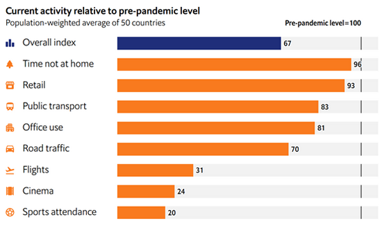 目前,这一指数为67%,代表着50个国家的整体经济已经回到了疫情前三分之二的水平。其中,离家外出,商店人流这两项指标都恢复到90%以上,但影院票房、场馆观众这两项指标还不到25%。