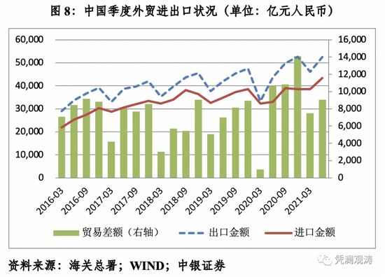 需要指出的是,进入二季度以来,因为出口与进口增速此消彼长,当季外贸进出口顺差同比下降15.3%(以人民币计值),一季度为同比增加6.84倍(见图8)。这表明从净额角度看,外需对经济增长的拉动作用或已开始趋于减弱。