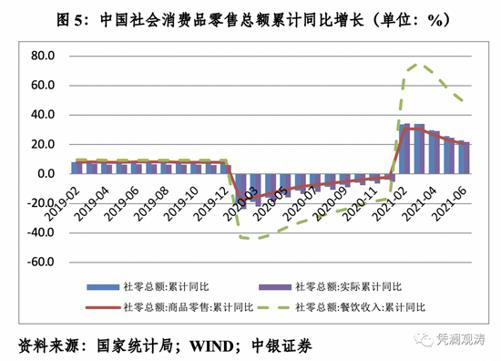 上半年,社会消费品零售总额两年复合平均增长 4.4%,较一季 度增速加快 0.2 个百分点,较 2019 年同期增速慢 4.0 个百分点,但缺 口较一季度收敛了 0.1 个百分点;剔除物价因素后,社零两年复合平 均增长 2.6%,较一季度增速快 0.4 个百分点,较 2019 年同期慢 4.1 个百分点,但缺口较一季度收敛了 0.6 个百分点(见图 5)。