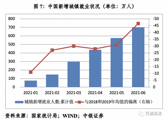 但值得关注的是,上半年新增城镇就业较2018和2019年同期均值低47万人,缺口为今年以来最大(见图7)。随着毕业季的到来,进入劳动力市场求职的高校毕业生不断增多,6月份,16-24岁城镇的青年调查失业率为15.4%,比上个月上升了1.6个百分点。鉴于今年高校应届毕业生规模达到909万人的新高,总量的就业压力依然较大,结构性失业的矛盾较为突出。