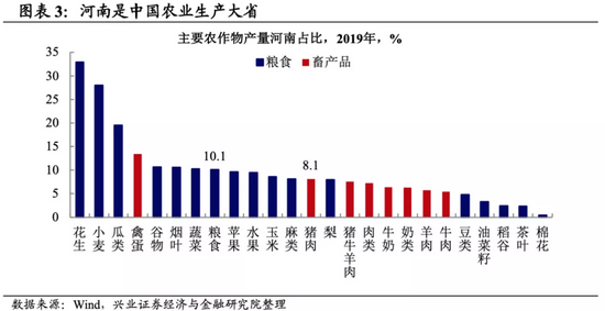 河南的确为全国重要的农业大省,粮食、猪肉产量占比分别10%、8%。本次河南降水持续时间比较长,且强降水发生的区域比较集中,造成了河南省大范围城市内涝、农田积涝。由于河南光热资源充足、土地资源肥沃、水资源丰富,是全国农业生产大省。2019年,河南生产了全国28.0%的小麦、8.6%的玉米以及8.1%的猪肉。