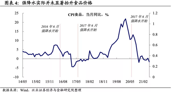 但从历史数据来看,CPI同比的食品分项在过去三次(2016年6月-7月;2017年6月-7月;2020年6月-7月)洪涝灾害后都未有明显抬升,食品价格依然沿着之前的逻辑在走,强降水的影响不大。