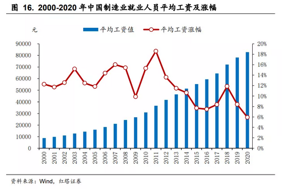 与之对应的,劳动力的成本也在提高。自2000年以来,我国制造业就业人员平均工资逐年上升,已经由2000年的8750元提升至了2020年82783元,20年间翻了9倍有余。低廉劳动力成本在国际分工中的竞争优势逐步削弱, 低端的廉价出口模式难以为继。
