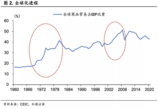 虽然全球化趋势在二战战后,伴随美国向日德的产业转移就已经开始了,但如果我们用商品贸易占GDP的比重来衡量经济全球化的进程,可以发现,直到70年代全球化进程才出现了质的变化。从1969年开始,在短短11年的时间里,全球商品贸易占GDP比重从18%迅速提升至42%,也就是说在1980年的时候,全球各国产生的GDP近一半都是通过国际间的贸易活动取得的。