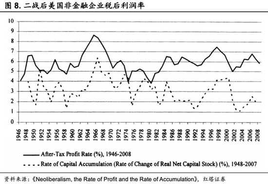 根据鲁保林的研究结果显示[2],1966-1982年间美国非金融部门的劳动生产率为1.31%,而工人实际工资增速达1.68%,实际工资相对于劳动生产率增长更快,企业利润被挤压。劳工成本高,导致实体回报率不足。