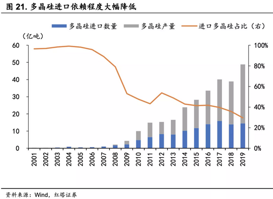 2018年,国产电子级多晶硅量产,实现了0到1的突破,这使国内产业对于上游进口原料的依赖程度大大降低。到2019年,多晶硅国内产量达34.4亿吨,进口多晶硅占比已由2001年的96.4%下降至29.6%。根据《2019-2020年中国光伏产业年度报告》,2019年中国大陆硅片产能达到173.7GW,占全球比重为93.7%,全球的光伏产业布局正在向国内集中。