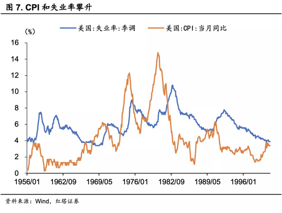 通货膨胀率和失业率攀升。由于石油等能源在CPI中的比重较高,油价的快速上行助推了通胀,CPI在80年4月达到了15%。同时失业率波动上升,在1982年末来到了阶段性的顶点10.8%。