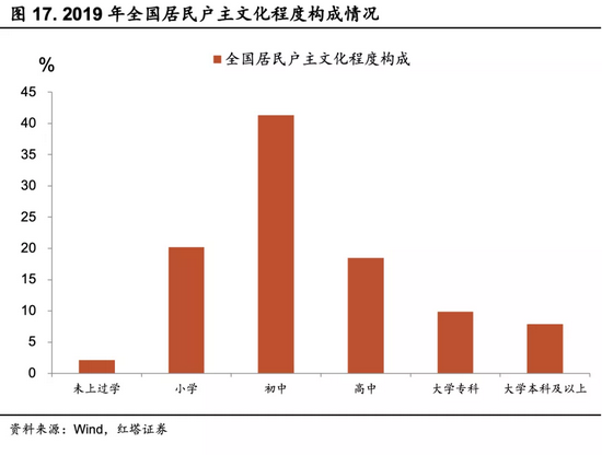同时我们统计了世界银行公布的劳动力中具有基础教育水平的劳动年龄人口比重,以美国和英国这两个老牌的发达国家为例,2019年这一数据分别是42.19%、60.49%,与中国同处亚洲的韩国是47.77%。