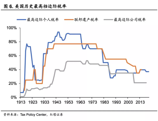 从50年代至60年代初,美国最高档个人所得税税率高达90%以上,这对于富人阶层的收入影响很大。在遗产税方面,冷战期间税率也一度高达77%,如果一个非常富裕的家庭的后代想要继承父母财产的话,超过3/4的部分都要被政府征收。同期的英国、日本等资本主义国家在美国的影响之下,也同样对富人实行着极为苛刻的税收制度。
