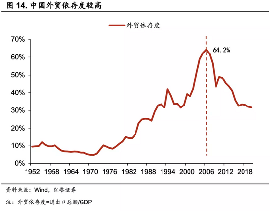 在过去的产业转移过程中,中国逐步形成了出口导向型的经济增长模式。在这样一个外贸依存度较高的经济增长模式之下,我国国内经济的运行对于国际市场形势的变化是非常敏感的。生产端进行再平衡既然是一个长期趋势,中国如果想要持续获取经济增长的新动能,过分依赖国际市场肯定是不可取的。