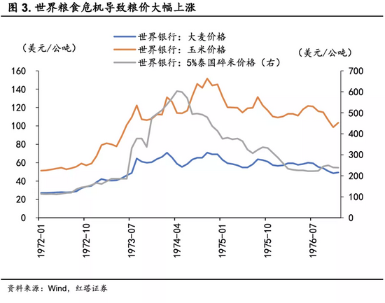1972-1974年间,受各种自然灾害的影响,全球谷物产量大幅减少,加上当时美苏关系有所缓和,苏联也开始进入到国际市场大量购买粮食,带动国际粮价迅速攀升。根据世界银行的数据显示,1974年底大麦、玉米价格相较1972年初分别上涨了155%、183%,5%泰国碎米价格涨幅甚至高达263%。