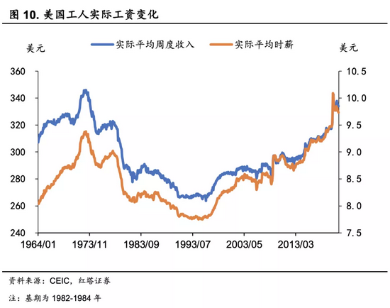 在这个期间,工人的工资待遇得到了空前的提升,美国生产工人实际的平均周度收入(剔除物价因素)从1964年初的307美元提升至1973年的344美元,涨幅达到12%。