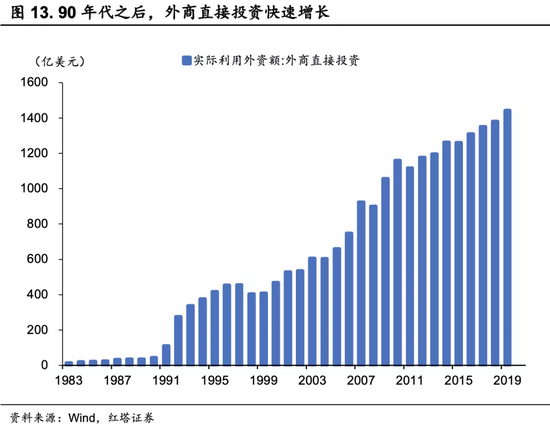 甲企业只是我们举的一个例子,在全世界像甲这样被地方政府趋之若鹜的外资企业还有很多。就是这样的一些高度亲商的优惠政策,再加上上面我们提到的人口红利,共同促进了外商直接投资(FDI)的快速增长。尤其在加入WTO之后,由于我国与国际市场的进出口贸易渠道更加畅通与便利,中国对于全球资本的集聚效应愈加明显,对外开放的步伐也有所加快。