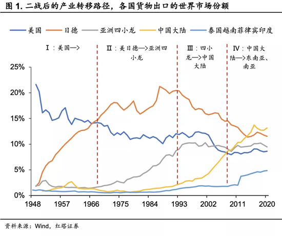 通过梳理,我们总结出二战后总共出现了四次国际产业转移,从美国到日本德国(50-60年代),从日德到亚洲四小龙(70-80年代)再到中国内地(90年代-08金融危机前)。现在我们正处于第四次产业转移的浪潮中,一些中低端制造业由中国内地向东南亚国家转移,而高端制造则有向老牌工业化国家回流的趋势。