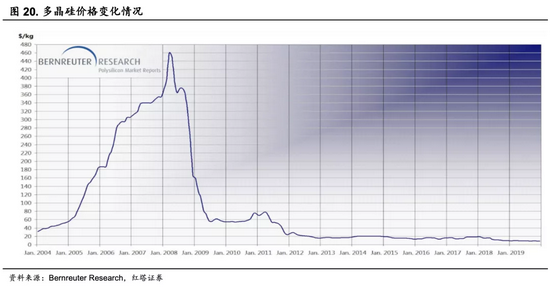 而金融危机的爆发致使前期扩张的产能开始过剩,多晶硅价格又跌回了与05年相当的水平(55美元/公斤)。在技术水平相当的情况下,国内那些不具备成本优势的企业面临的严重财务危机乃至破产清算,很大一部分多晶硅项目、产能被推迟甚至遭到遗弃。不过后续随着经济的修复,需求有短暂的回暖,硅料价格也开始回升。