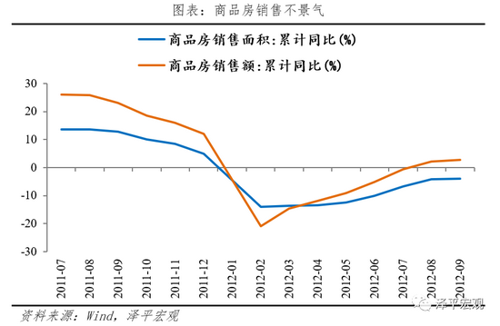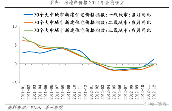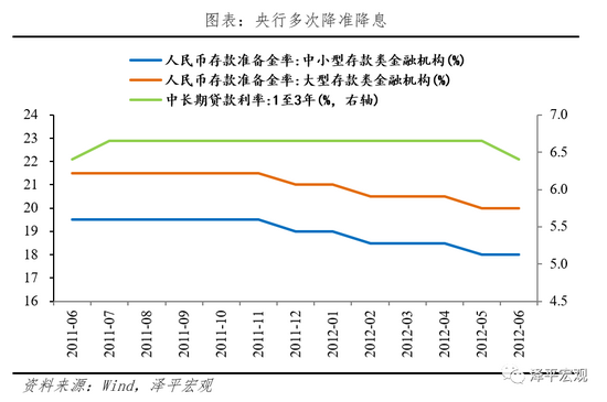 (2)政策操作:宽货币、宽财政、控地产。为应对经济下行,2011年底政治局会议和中央经济工作会议定调“稳增长、调结构、管理通胀”,标志政策重心从控通胀转向稳增长。货币政策方面,央行自2011年4季度累计实施3次降准,自2012年2季度起总计实施2次降息,同时,2012年起,我国数量型货币政策开始向价格型转变,推进利率市场化改革,央行对存贷款利率浮动区间进行调整,发挥差别准备金动态调整机制的逆周期调节作用,以促进信贷增长。财政政策方面,发力基建,同时上调个人所得税起征点,增加居民的可支配收入。房地产政策方面,依然坚持调控基调,限购不松,但部分地区公积金政策松动,注重保障房建设。