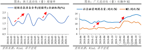 狭义流动性与广义流动性相互影响。一方面,狭义流动性是广义流动性的供给基础。商业银行发放贷款,需要缴纳存款准备金,此时,作为超额存款准备金的狭义流动性减少,用以支持广义流动性的扩张。另一方面,广义流动性不一定与狭义流动性同步变化。如果融资需求不足,或者严监管束紧资金流入渠道,广义流动性无法扩张,可能会导致狭义流动性淤积。