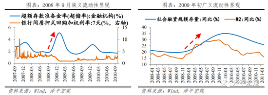 狭义流动性层面,伴随2008年9月央行降准降息,狭义流动性拐点出现,超储率从2%左右大幅提升至年底5.11%,银行可用资金增加,狭义流动性充裕,R007中枢从2008年10月3.7%的高位快速下行至2009年初的0.9%。广义流动性层面,宽松的货币政策叠加庞大的基建计划和房地产投资需求,2008年11月宽货币几乎同步传导至宽信用。2008年底社融增速由20.5%增至2009年底的34.8%,M2增速也由14.8%回升至29.74%,GDP在2009年Q1触底,仅两个季度快速企稳。