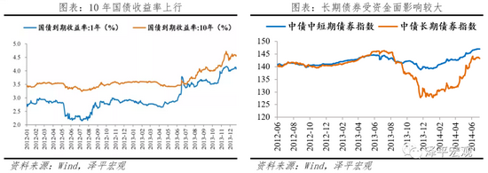债市走熊。伴随2012年7月狭义流动性收紧,收益率10年国债到期收益率大幅抬升,由3.4%快速攀升至4.5%。长期债券指数受资金面影响,下行幅度较大,短期债券指数在宏观经济基本面的支撑下相对稳定。