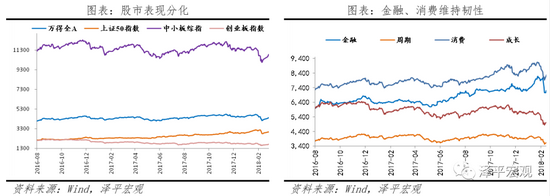 股市:股市分化,流动性向龙头集中。主板明显跑赢创业板,沪深300、创业板指数2017年全年分别涨超20%、跌超10%。但2017年末起,经济进入实体去杠杆阶段,社融增速快速下滑,股市各板块均呈现大幅调整,2018年沪深300、创业板指数均跌逾20%。分阶段看,2016年8月-2017年10月期间,金融、消费表现出色;2017年11月-2018年3月进入紧信用区间,大幅调整,成长股、周期股表现弱势,金融、消费仍有韧性。