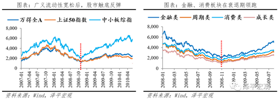 股市:广义流动性宽松后,股市触底反弹。狭义流动性宽松期(2008.9-2008年末),即经济危机初期,股市总体延续下行趋势,万得全A跌破1300点,中小板综指和上证50指数分别上涨-29.8%和-31.1%。金融类、周期类、消费类、成长类板块的涨幅分别为-24.2%,-27.98%,-24.2%,-27.96%,金融、消费类股票相对抗跌。广义流动性宽松期(2008年末-2009.6),受益于盈利改善和估值上升,股市普涨。万得全A,上证50和中小板指分别上涨105%,82%和118%,中小板涨幅领先。自2008年末股市回暖以来,金融类、周期类、消费类、成长类板块的涨幅分别为117%,115%,98%和126%。