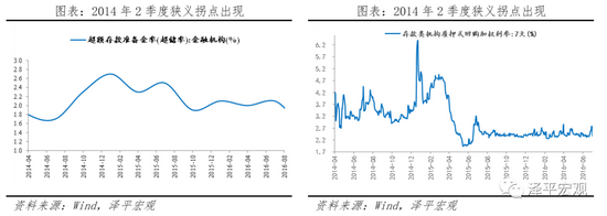 2014年4月,央行陆续开展降息操作,银行可用资金增加,狭义流动性转松,超储率自低点明显上行,于2014年6月的1.7%低点持续攀升至2015年12月的2.7%附近;存款类机构质押式回购利率中枢随之震荡下行至年内地位的2.8%附近;10年国债收益率也由4.2%附近震荡下行至3.5%附近。