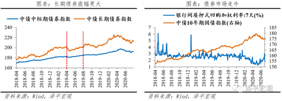 债市:债市走牛,利好长债。2018年2季度货币政策转向宽松,DR007下行明显,中债国债指数上行,曲线较为陡峭。在阶段一(2018.04-2019.04),中短期和长债的涨幅分别为11.7%和18.3%。在阶段二(2019.08-2020.04)中短期和长债的涨幅分别为12.5%和21.1%,长期债券相对中短期债券涨幅更大,拉长债券久期可以博得更高的利率下行收益。