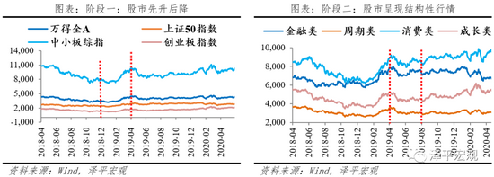 阶段一(2018.04-2019.04):2018年,受制于中美贸易摩擦、经济下行、货币政策传导不畅等原因,股权质押暴雷,股市深度调整。2019年降准,广义流动性宽松,叠加注册制改革激发市场活力,A股迎来小牛市,年初至4月,上证50、中小板综指和创业板指数分别上涨25.4%,35.0%,37.8%。金融类、周期类、消费类和成长类板块的涨幅分别为33.2%,31.6%,42.4%,36.5%,消费类板块表现更为亮眼。